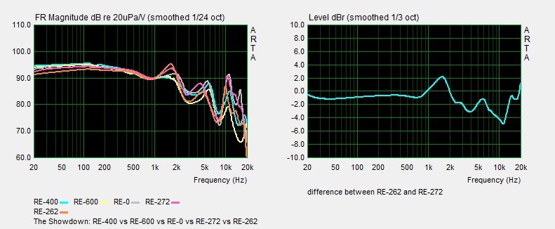 ON SECOND THOUGHT #4: Here's a simple showdown among RE-0, RE-262, RE-272, RE-400 and RE-600, with their measurement condition equally matched. While the deviation between RE-400 and RE-600 is only a simple treble cut of -4 dB above 2 kHz, RE-262 and RE-272 have totally different resonant characteristics.